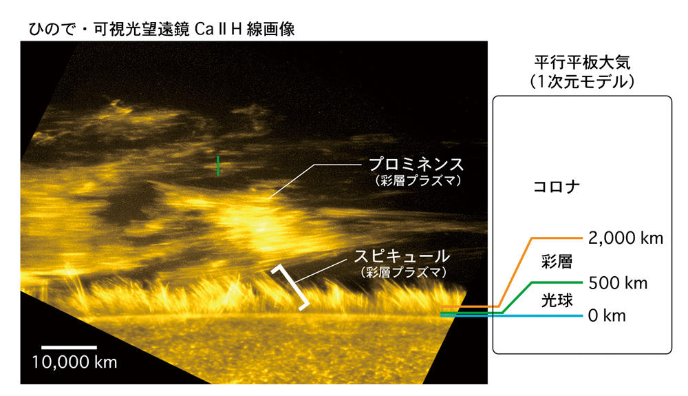 よく見ると光の破線が現れているのは彩層からコロナ層にかけてだ。フレアやプロミネンスと同じ位置で消える。