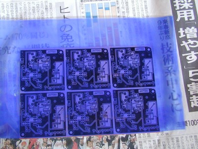 なんちゃって青いシートの作り方では、「なんちゃって青いシート」を作りましょう。まず、発泡スチロールのトレーにポスターカラーと洗濯ノリを垂らします。量は適当でいいです。A4で1〜2枚塗れる分、適当に垂らします。 垂らしたら、十分に刷毛でまぜます。この時少々固くても水は入れないで下さい。 十分混ぜたら、OHPシートに塗ります。ポスターカラーを混ぜたのは、透明な洗濯ノリでは塗りむらがわからないからです。ですから色は自分の好きな色を使って下さい。 刷毛でまんべんなく塗ります。色が付いていると塗りむらがわかって便利です。シートの端は印刷されないので、指で押さえておきます。 あとはここまま半日ほど乾かして完成です。塗った面がプリントされるように、レーザープリンタの手差しで入れます。プリンタの設定は、モノクロ、濃度は最高にしておきます。また、トナーで転写した場合、トナーがつぶれるので、最初からつぶれを想定したパターンを作っておきます。筆者は、EAGLEを使いましたが、すべての間隔を20milに設定しました。 アイロンで転写レーザープリンタで印刷したなんちゃってシートを基板に合わせて切ります。画像はすでに切った後の残りです。なんちゃってシートをプリント生基板に貼り付ける前に、生基板をスチールウールで磨いて下さい。できれば、パーツクリーナーで洗浄します。パーツクリーナーはホームセンターで売っています。1本、300〜500円くらいです。銅箔の表面に細かい傷を付けるとトナーが接着しやすくなります。 ちなみにこれは、ポスターカラーを入れないで作ったシート。塗りむらがわからないので、ミスが出やすかった。 アイロンの温度は中よりも若干上に設定します。高い温度で、トナーを溶かして転写してやります。パターンがつぶれるのを想定してパターンを書いているので、ぎゅっと上から押しつけてアイロン掛けしてやります。この時のコツは、大きめの基板に余裕を持って転写シートを貼る。はじっこはどうしても転写ミスが出やすいです。トナーのつぶれを恐れずに、高温で一気に押さえる。 アイロンで押さえていくとシートが密着して、パターンが浮き上がってきます。煙が出るくらいの温度でやっています。 パターンがつぶれてきたら、そこには力を加えないようにします。 アイロン掛けが終わったら、水で冷やしてシートをはがします。青いノリが残る場合は、お湯で溶かしてノリを除去します。もし、転写ミスがあったら、マジックインキなどで修正します。白い修正液も便利です。 パターンをチェックしたら、いつものエッチングです。 何も修正しない状態でそのままエッチングしたモノが、上です。下は、トナーをスチールウールで削った後です。トナーはエタノールでも落ちるそうですが、筆者はせっせと磨いています。 若干、パターンのつぶれが見られます。 しかし、この程度でしたら、市販品のシートでもよくあることでした。OHPシートに洗濯ノリを塗った方法なら、1枚あたり60円程度で作れます。失敗したら、スチールウールでごしごし削れば、何度でもやり直しできます。 じつは後で気がついたのですが、洗濯ノリを使っているので、はがし終えたあとのシートを水で洗うと、元に戻ります。切らないでA4のままの大きさで使えば、OHPシートを再利用することも可能なのです。 レーザープリンタで「なんちゃって青いシート」にパターンを印刷、アイロンで生基板に転写してエッチングするまで、約1時間で完了します。EAGLEであらかじめ基板パターンを製作しておく手間はかかります。でも、この方法を使えば、かなりお手軽にプリント基板を作ることができます。 次の目標は両面基板の製作です。乞うご期待! |